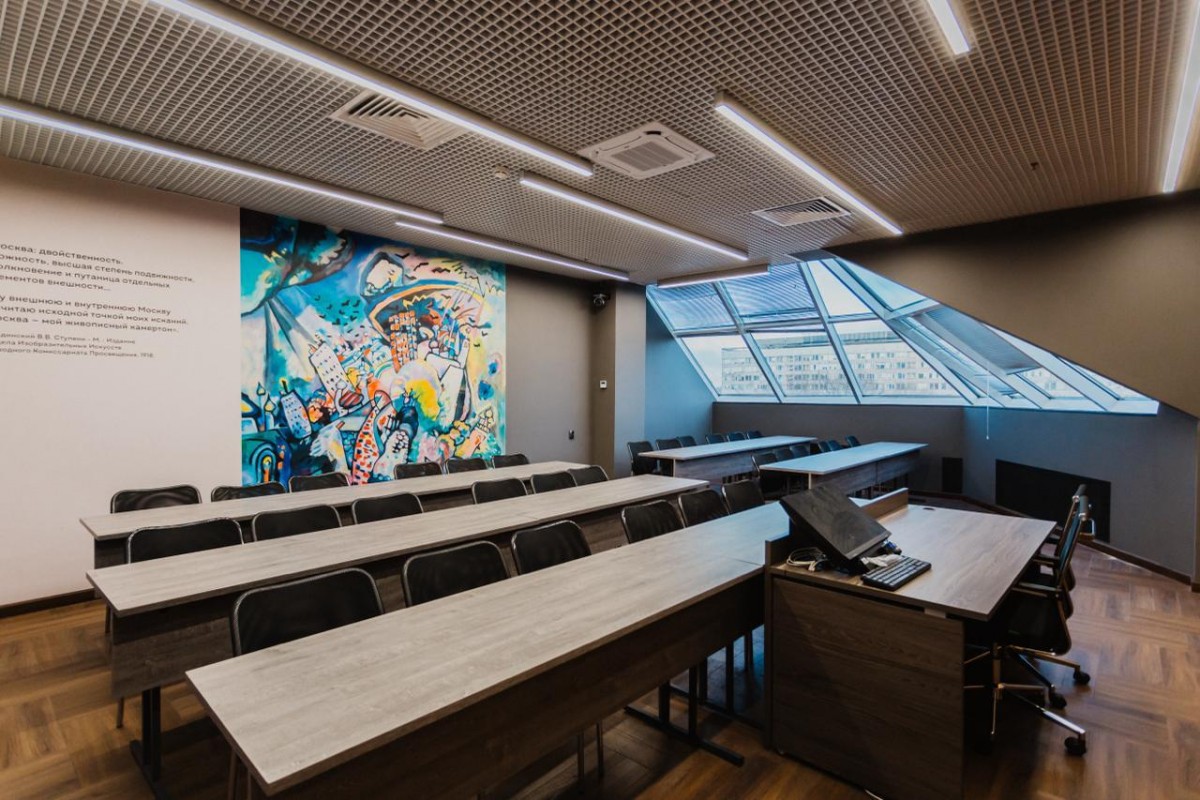 Аудитория 633 Б 4-го корпуса Юридического факультета МГУ - это красивое современное пространство, в котором стены оформлены сюжетами произведений Василия Васильевича Кандинского.