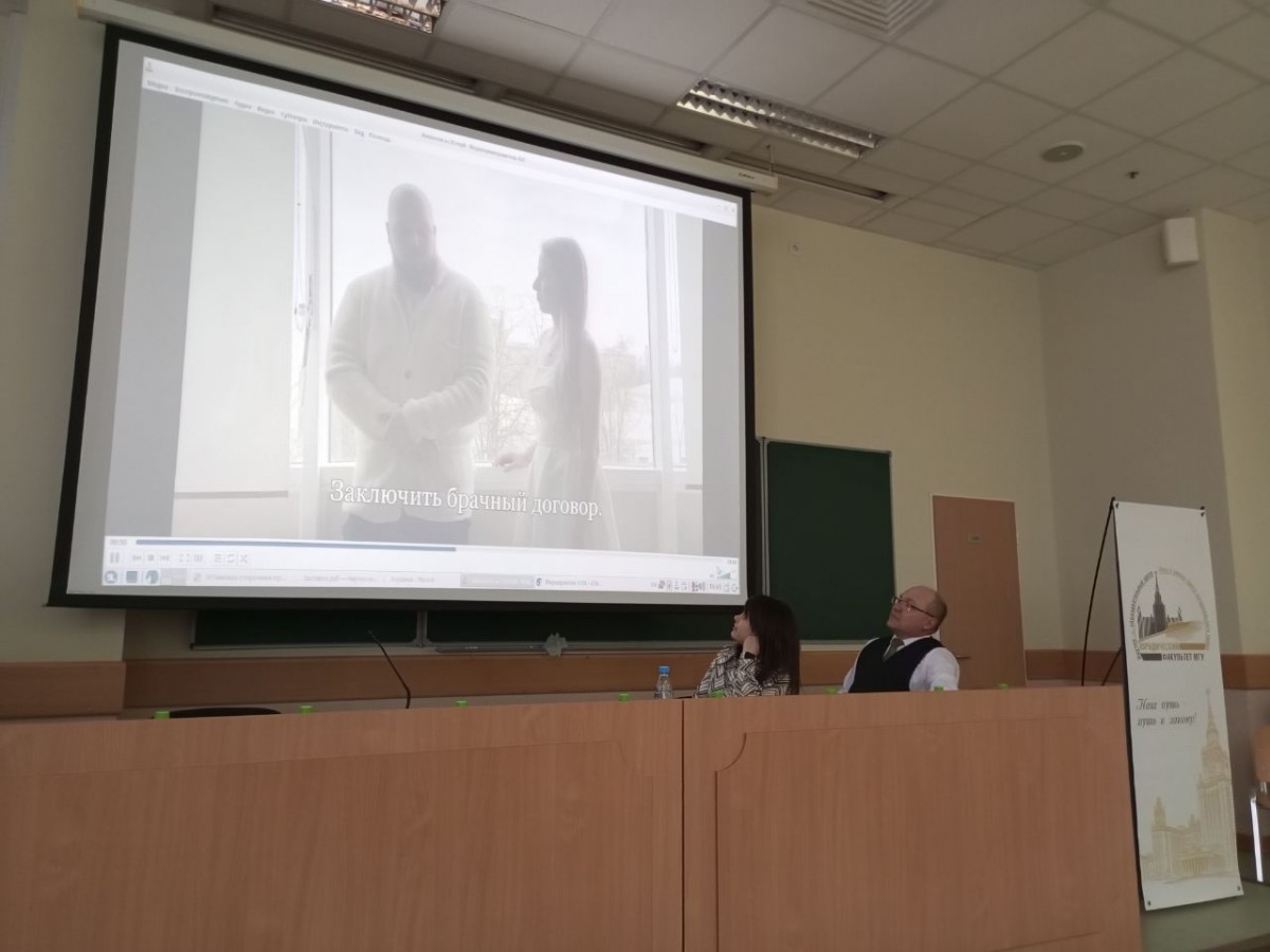 Дарья Неврова и Максим Щапов в игровой форме смоделировали ситуацию, когда будущие супруги встали перед выбором: стоит ли заключать брачный договор. Вначале ситуация была показана в видеоролике, а затем, продолжена уже в аудитории. Дарья и Максим в роли потенциальных «супругов» Ольги и Петра, задавали вопросы экспертам. В качестве последних выступили практикующие юристы, нотариусы и преподаватели. Так, квалифицированные ответы давали «адвокат», «судья» и «нотариус», кроме того, в дискуссии принимали участие и студенты, которые вместе с экспертами отвечали на вопросы «будущих супругов».