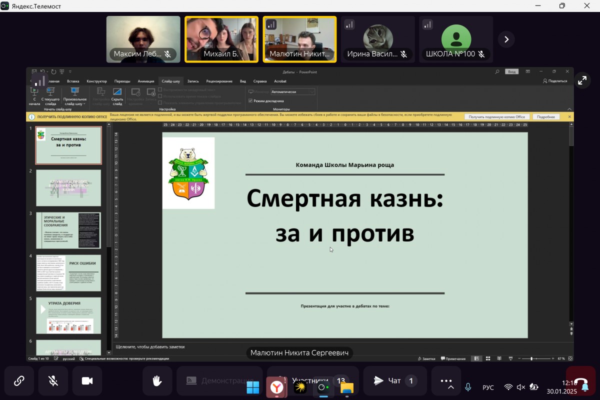 30 января 2025 года в онлайн-формате в рамках проекта «Лица дружбы» состоялись ученические дебаты между ГБОУ «ШКОЛА № 100 Г.О. ДОНЕЦК» (ДНР) и ГБОУ Школа Марьина Роща (Москва), координатором которых выступил Центр нотариального права «Путь к закону».