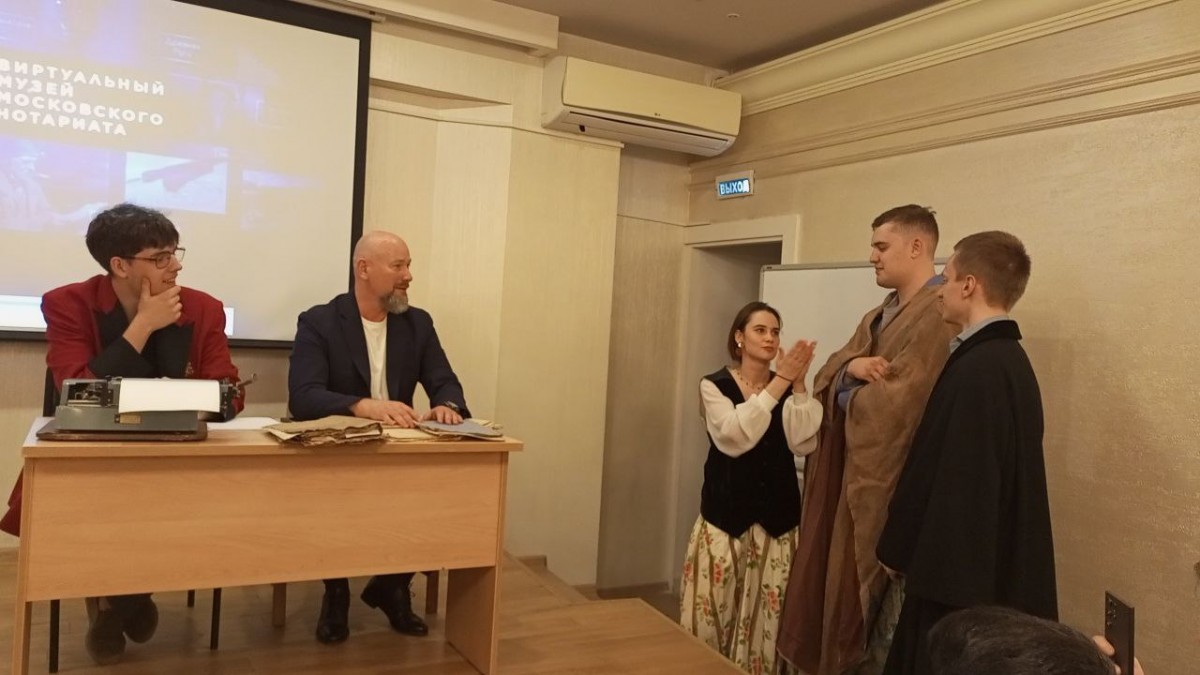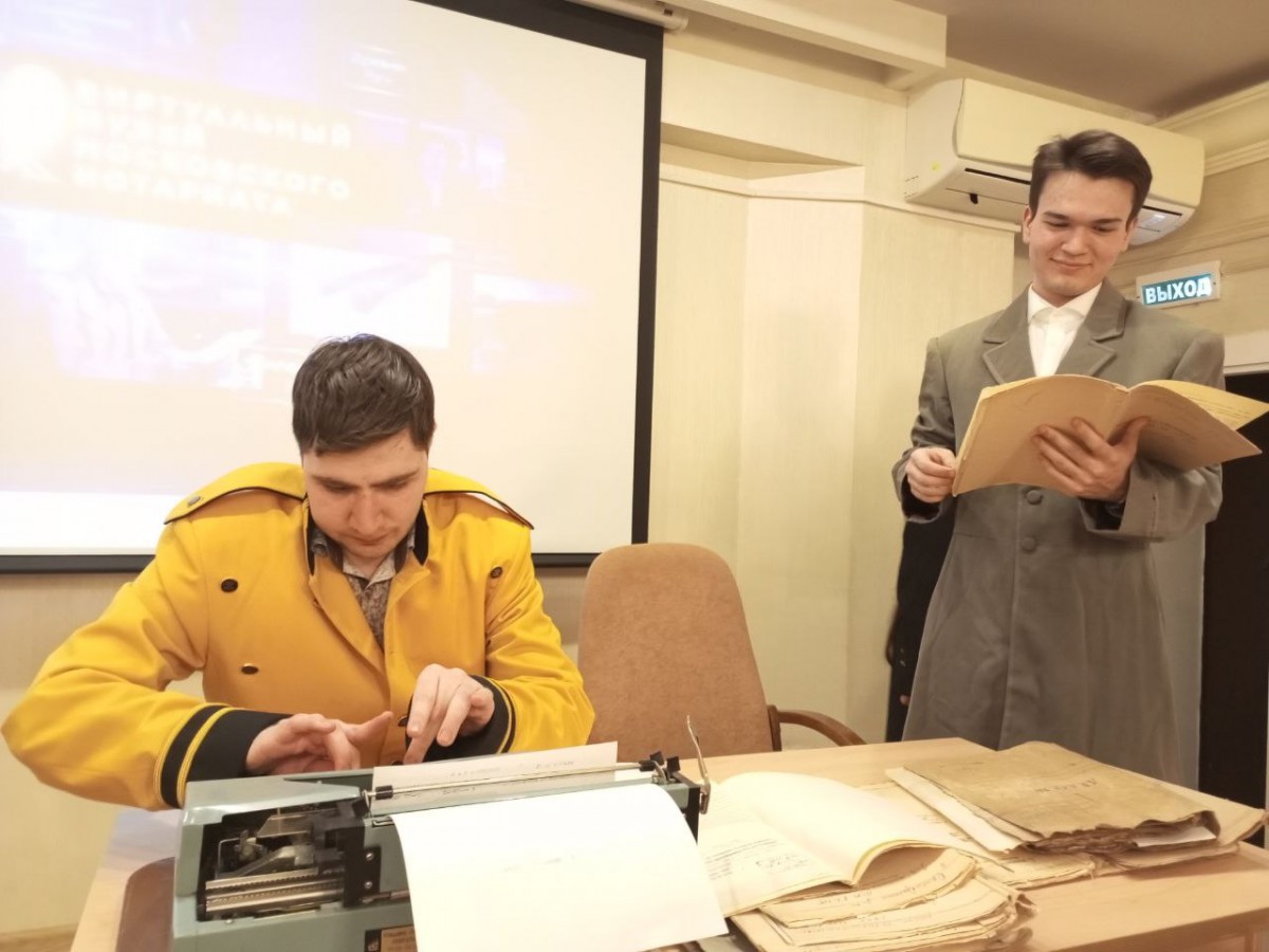 Также желающие могли примерить как повседневную, так и форменную одежду служащих государственных учреждений дореволюционного времени. Студенты с энтузиазмом откликнулись на предложение разыграть небольшую костюмированную сценку из жизни нотариусов.