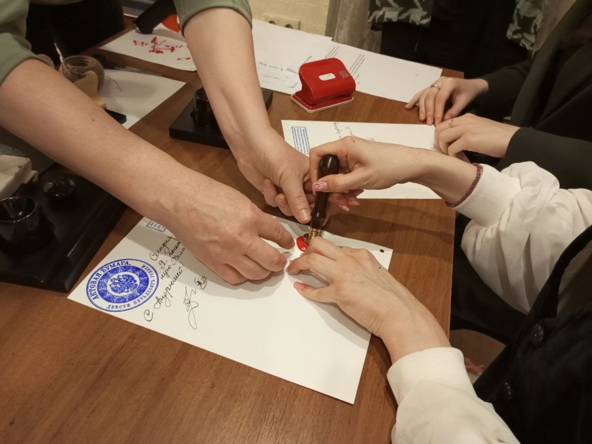 Затем участников экскурсии пригласили ознакомиться с экспозицией музея нотариата и поучаствовать в мастер-классах по подготовке нотариальных документов с помощью пера и чернил или на механической пишущей машинке. Прошитые и скрепленные сургучной печатью документы, экскурсанты забрали в качестве сувениров на память.