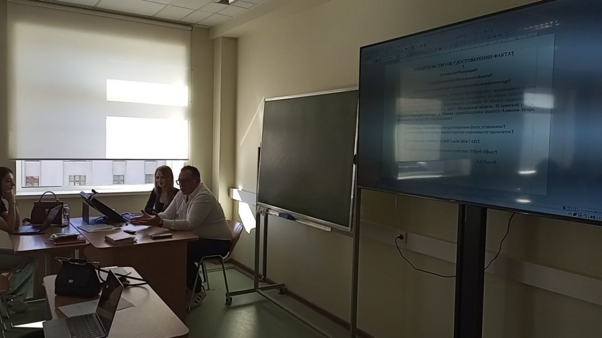 Андрей Николаевич Радаев, член клуба выпускников, работающих в области нотариального права, нотариус г. Красногорска, на примерах образцов удостоверения факта нахождения гражданина в определённом месте, удостоверения тождественности личности гражданина с лицом, изображённым на фотографии, удостоверение факта наличия сведений в Едином государственном реестре недвижимости и на других примерах объяснил студентам тонкости и нюансы при составлении данных документов, а также рассказал о нестандартных случаях из практики.