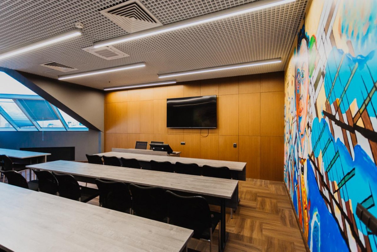 Аудитория 633 Б 4-го корпуса Юридического факультета МГУ - это красивое современное пространство, в котором стены оформлены сюжетами произведений Василия Васильевича Кандинского.