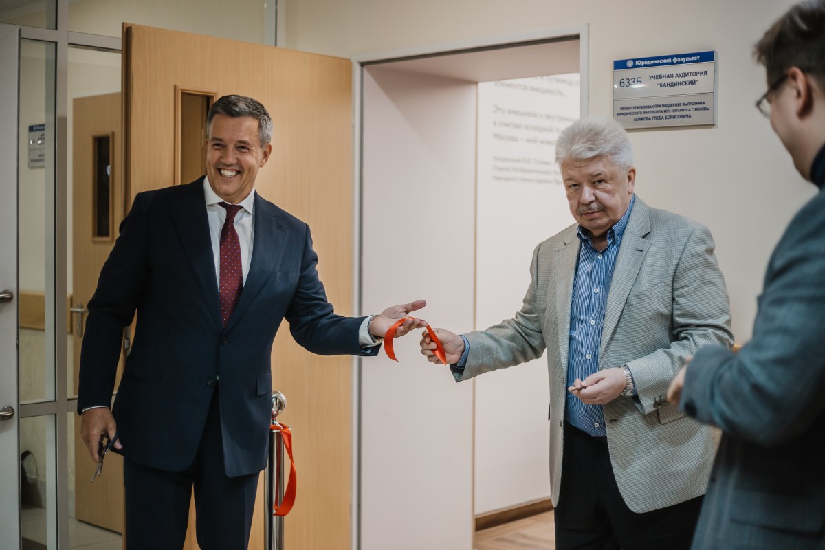 Открытие аудитории было бы невозможно без активного участия выпускника Юридического факультета 1993 года, члена Клуба выпускников Центра нотариального права «Путь к закону», нотариуса города Москвы Глеба Борисовича Акимова, благодаря которому мы имеем возможность поддерживать связь творчества и права на факультете.