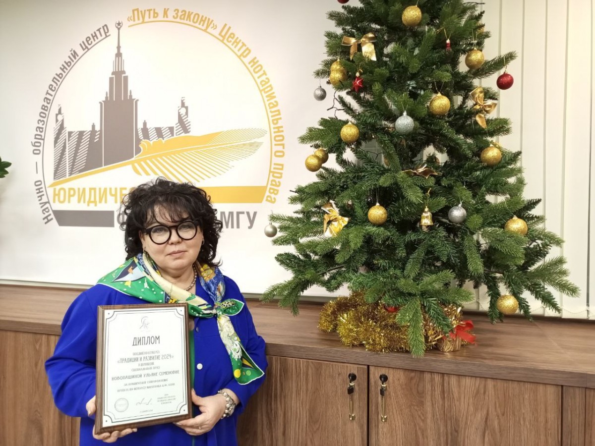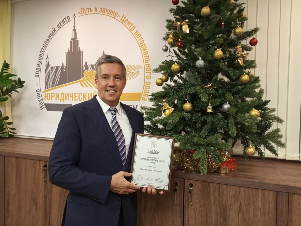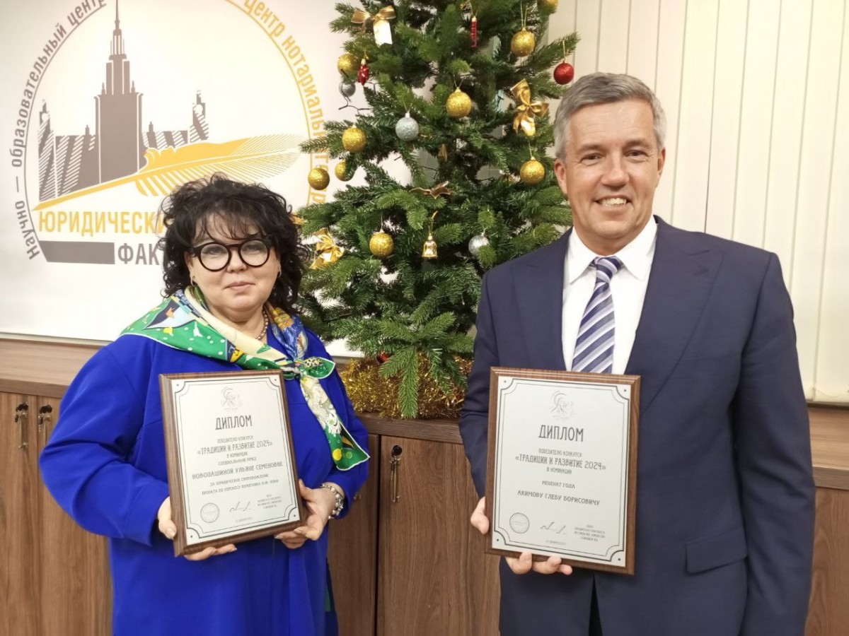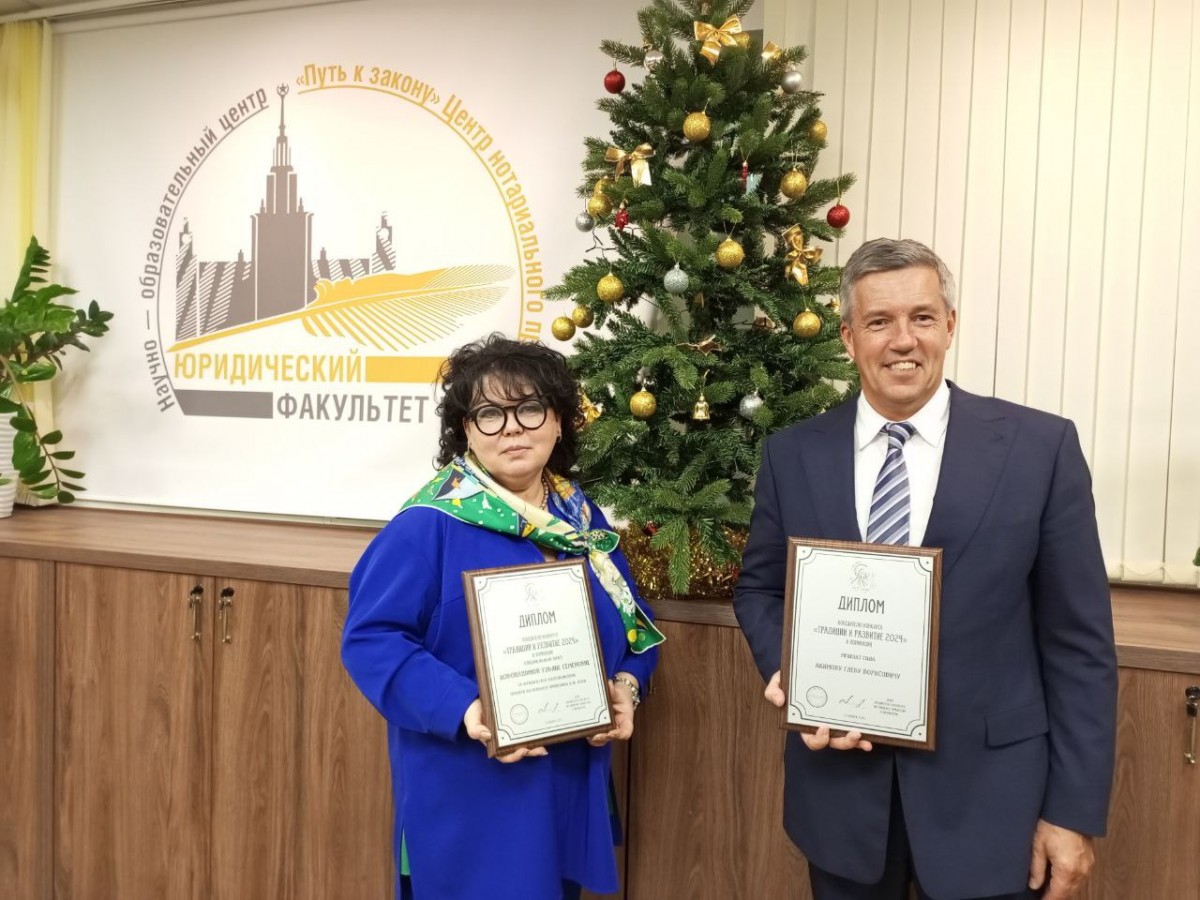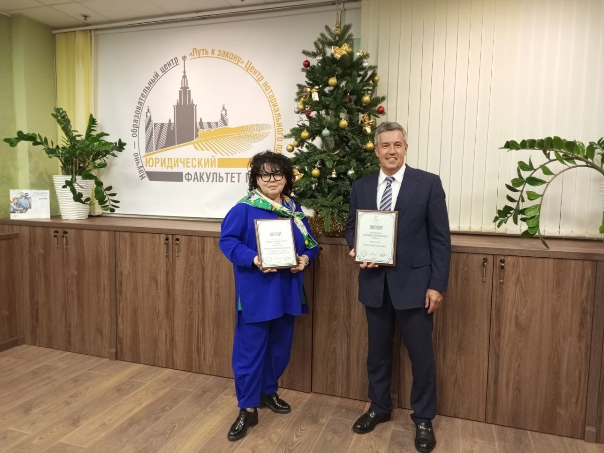 Декан факультета Александр Константинович Голиченков подвёл итоги работы за 2024 год, поздравил юбиляров и коллег, которые в уходящем году удостоились почетных званий и наград. Среди награждённых памятными дипломами были представители Центра нотариального права "Путь к закону": заместитель директора Центра, нотариус г. Москвы Ульяна Семеновна Новопашина (Специальный приз "За юридическое сопровождение проекта по переносу памятника Анатолию Федоровичу Кони") и член Клуба выпускников Центра, нотариус г.Москвы Глеб Борисович Акимов (Меценат года).