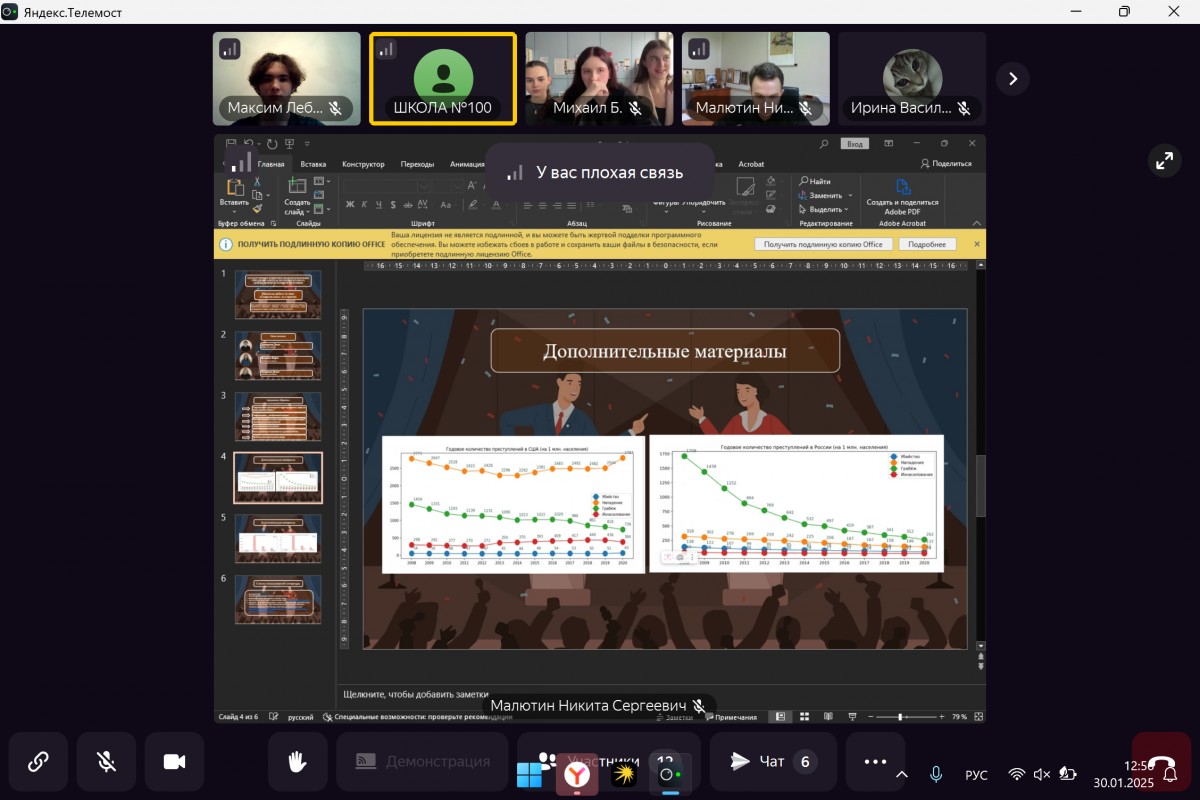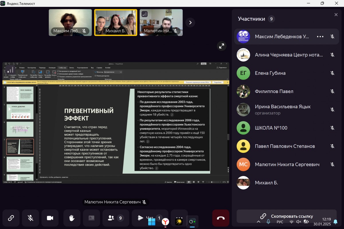 30 января 2025 года в онлайн-формате в рамках проекта «Лица дружбы» состоялись ученические дебаты между ГБОУ «ШКОЛА № 100 Г.О. ДОНЕЦК» (ДНР) и ГБОУ Школа Марьина Роща (Москва), координатором которых выступил Центр нотариального права «Путь к закону».