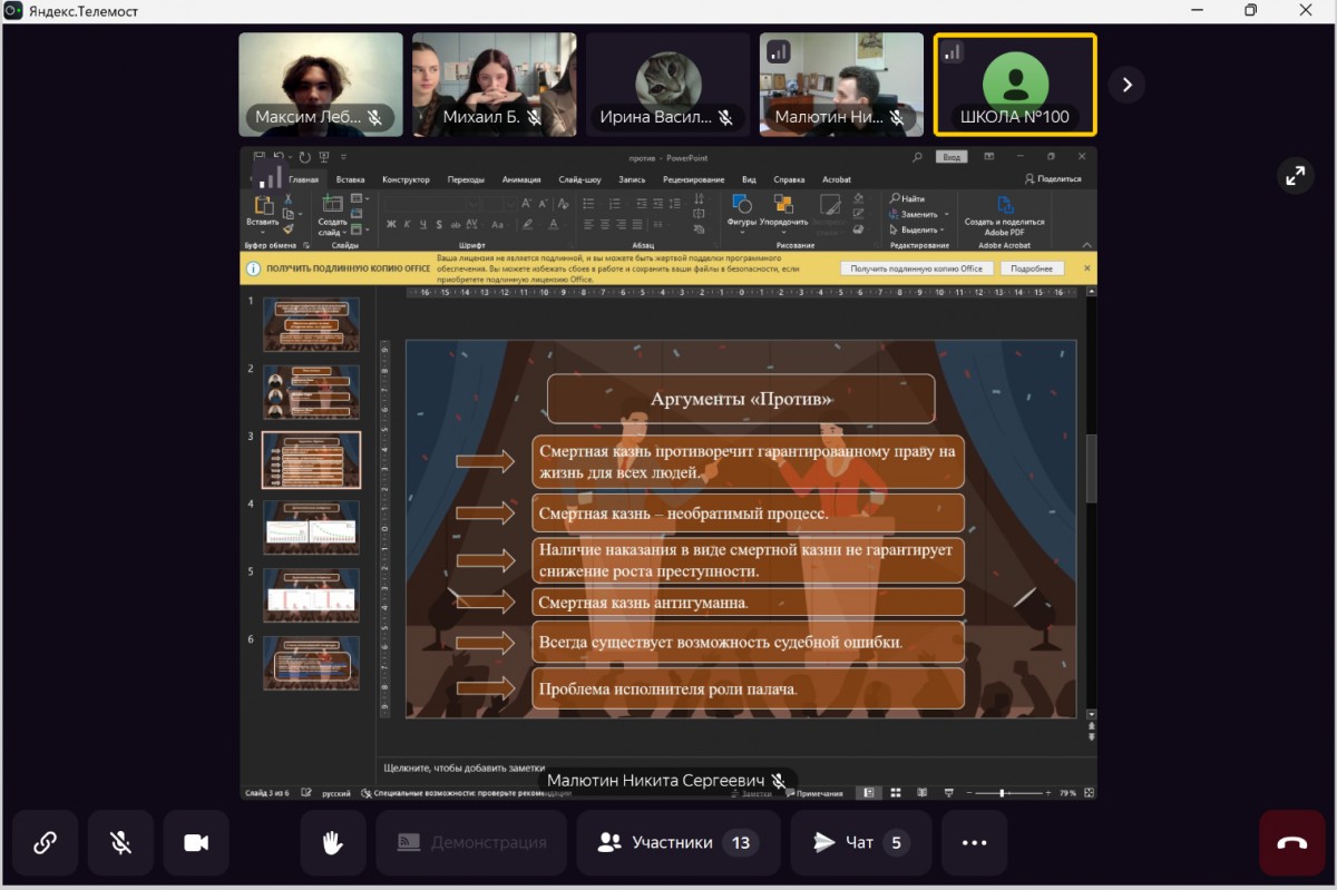 Можно с уверенностью сказать, что обе команды получили удовольствие и бесценный опыт от игры. Дебаты дали возможность для общения и взаимодействия между учениками из разных школ и городов, что, безусловно, способствует укреплению социальных связей и созданию дружеской атмосферы.