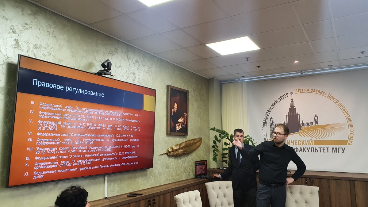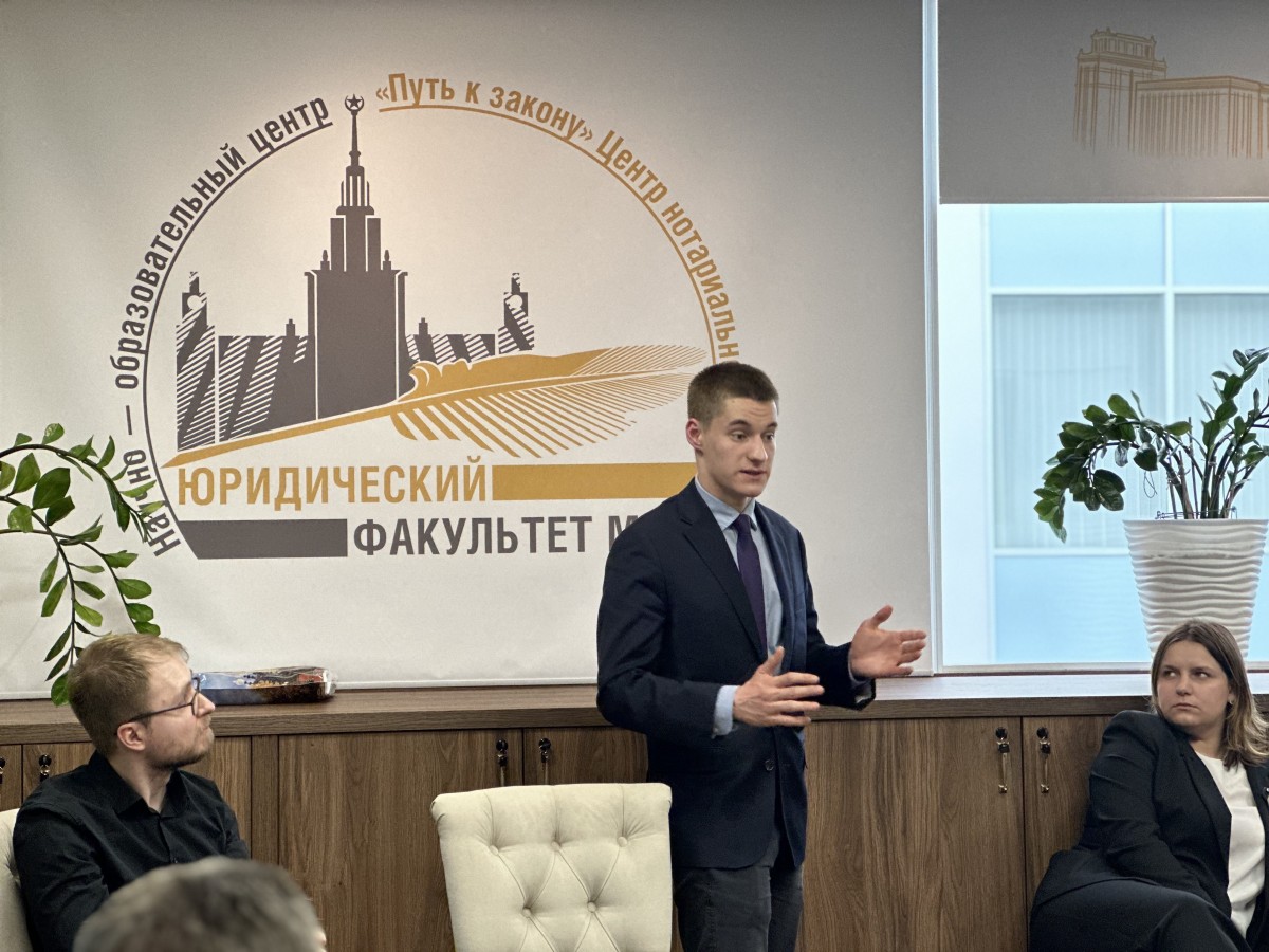 Модераторами мероприятия выступили директор НОЦ «Центра нотариального права», доцент кафедры гражданского процесса юридического факультета МГУ им. М.В.Ломоносова Аргунов Всеволод Владимирович и заместитель директора НОЦ "Центр нотариального права", преподаватель кафедры гражданского права юридического факультета МГУ им. М.В.Ломоносова Новопашина Ульяна Семеновна, студент 2 курса Юридического факультета МГУ им. М.В.Ломоносова Лопатин Егор.
